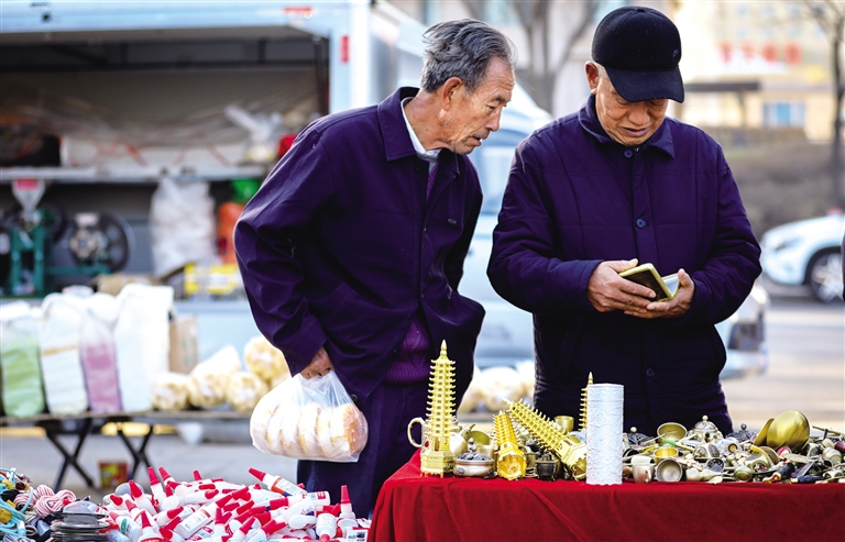 9时许,早市迎来了客流小高峰,黄牛肉、羊脊骨、水果、刚出锅的豆腐……摊位前排起长长的队伍,除了老年人,还有很多年轻人前来选购,感受城市烟火气。