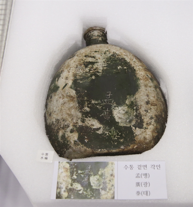 志愿军烈士遗物中一个军用水壶上,经识别刻有“孟广泰”字样。   摄影/新华社记者 姚琪琳
