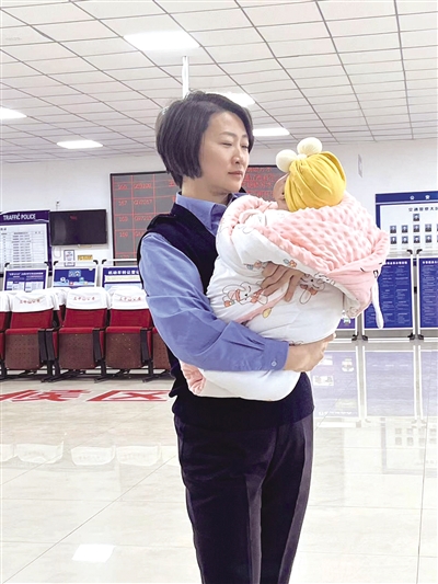 在李淑丽耐心地哄逗下,小宝宝停止了哭闹。就这样,在两个多小时的业务办理中,李淑丽一直温柔地当着“临时妈妈”。
