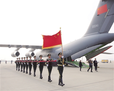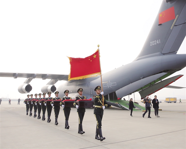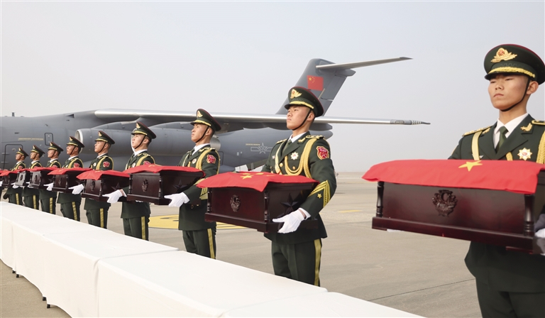 交接仪式上,中国驻韩国大使为烈士棺椁小心覆盖上五星红旗。现场所有人向烈士遗骸鞠躬致敬。礼兵手捧烈士棺椁登上运-20专机,启程返回祖国。