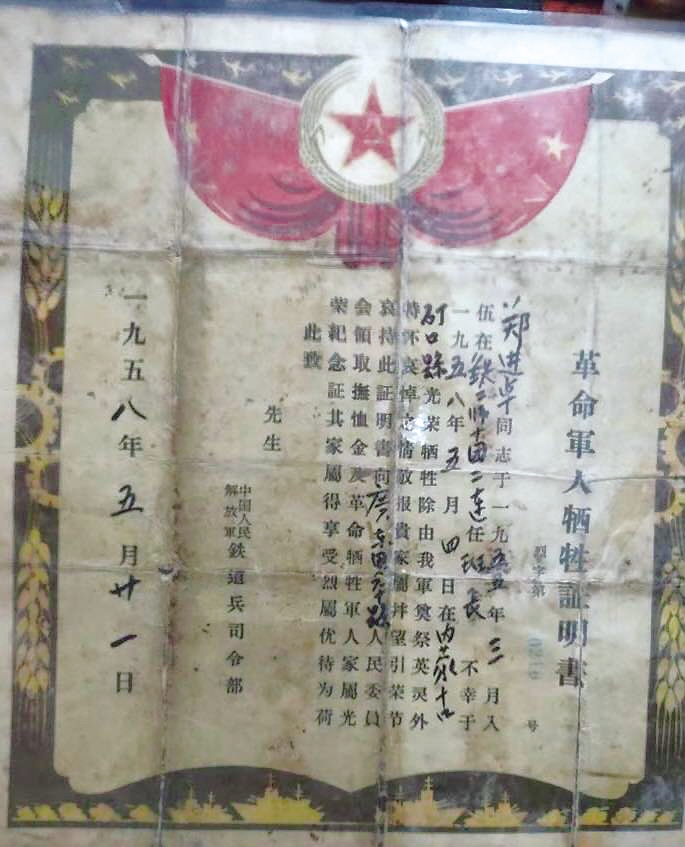 一年前,郑茂庭与本报取得联系,他告诉记者,郑进卓祖籍广东恩平,兄弟三人,郑进卓是家里幼子,也就是他们的三叔。当时,为了减轻家庭负担,同时受到早年参加革命的二哥影响,1955年,18岁的三叔参军离开家乡。很快,三叔成了一名铁道兵战士,曾任铁道兵二师十团二连班长。参军后,三叔再也没回过家。1958年,21岁的郑进卓牺牲在磴口县。几十天后,一封牺牲证明被送回郑家。可由于当时历史条件所限,家里人不知道他安葬在何处,这也成为郑家最难以释怀的遗憾。