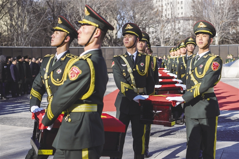 全体人员向志愿军烈士三鞠躬,27名部队官兵鸣枪12响,向英烈致以崇高敬意。《思念曲》再次低回奏响,礼兵们抬起志愿军烈士棺椁,绕广场半周,缓缓走向安葬地宫。自2014年以来,我国连续10年以隆重礼仪迎接总计938位志愿军烈士遗骸归国安葬,让他们回到祖国的怀抱。