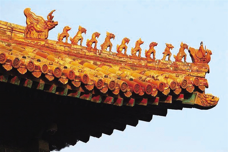 说完这个鸱吻,我们再说说故宫太和殿上这蹲一排的跑兽,你能看出来这十位闲得发慌的都是什么动物吗?