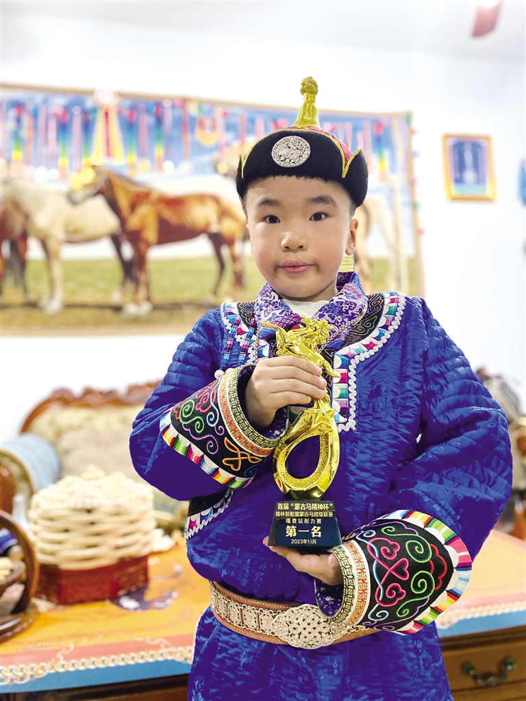 乌云苏德对儿子走红并不意外。2016年3月出生的安其乐,“驾龄”已有5年,参加赛马比赛也有两年多的经验。他从小就喜欢马,平时父母在马厩干活时,蹒跚学步的他就会过来帮着填草喂料。正是这样的耳濡目染下,安其乐逐渐熟悉了马的习性。