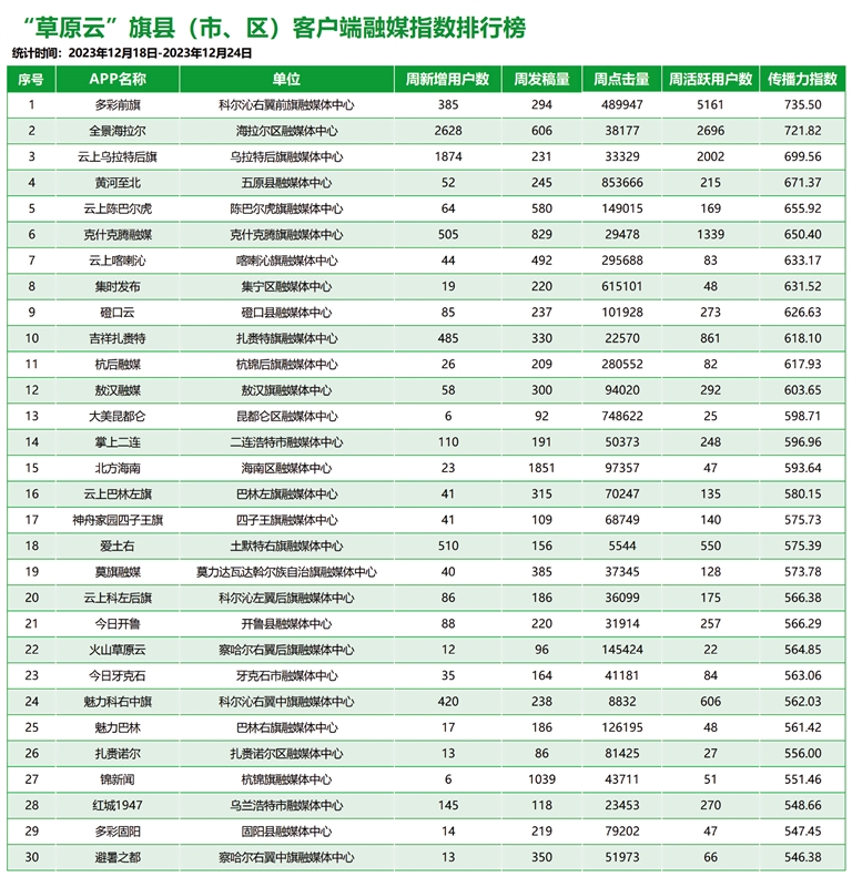 本周“草原云”旗县(市、区)客户端融媒指数排行榜“多彩前旗”位列排行榜第一位,传播力指数735.50;“全景海拉尔”位列排行榜第二位,传播力指数721.82;“云上乌拉特后旗”位列排行榜第三位,传播力指数699.56。