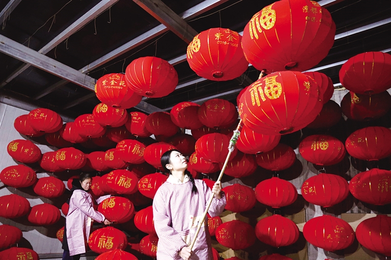 12月27日,邢台市南和区东三召乡一家灯笼作坊工人在晾晒灯笼。新年临近,河北省邢台市南和区的灯笼作坊加紧制作红灯笼,供应节日市场。(据新华社报道)
