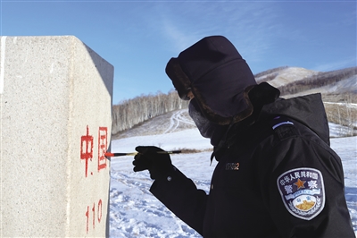 1月1日,新年第一天,呼伦贝尔额尔古纳边境管理大队民、辅警在零下40℃的严寒天气下,对边境线进行巡逻踏查和界碑描红。 摄影/草原全媒·北方新报记者 刘 惠 通讯员 李永健