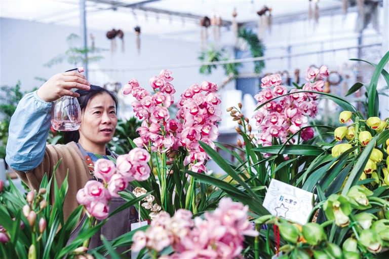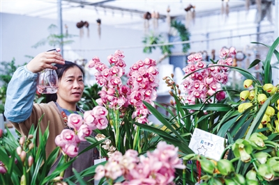 1月4日,工作人员给大花蕙兰喷水。元旦过后,浙江省金华市金东区澧浦镇花卉苗木城内,600余家花卉苗木商户开始展销不同品种的年宵花,1000多个品种的年宵花卉供市民、游客挑选。金华市金东区花卉苗木栽培历史悠久,是全国重要的花木产区。摄影/新华社记者 徐 昱