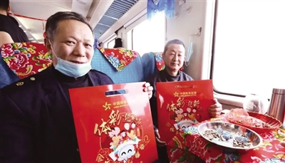火红的灯笼一字排开,喜庆的“福”字贴上车窗。游客们手拿中国体育彩票的新年礼包、手写对联、祥和的中国结,脸上喜气洋洋……经过工作人员的精心布置,列车餐车张灯结彩,浓浓的节日气氛扑面而来,引来了不少旅客拍照留念。