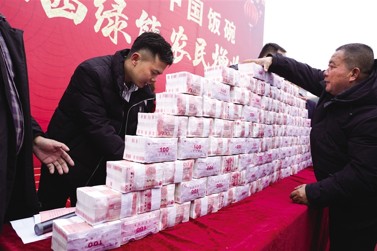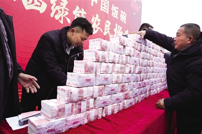 1月8日,工作人员在码放准备发放给种粮能手的奖金。当日,江西省南昌市安义县的种粮大户凌继河给种粮能手和员工发放1169万元现金作为年终奖,一对种粮能手夫妻年收入可达12万~30余万元。这是凌继河连续13年给农民发放年终奖。据介绍,凌继河2010年回乡创业,将流转的田地分块交给其他种粮能手管理,并确定一个基本产量。这些种粮能手平时每月预领基本工资,到年底根据全年总产量领取奖金,公司则提供选种、播种、除草、收割等社会化服务。 摄影/新华社记者 周 密