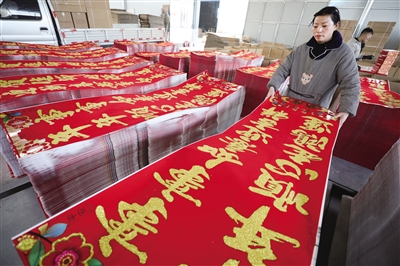 1月9日,村民在整理春联。随着春节临近,河南省焦作市温县赵堡镇赵堡村迎来春联产销旺季,村民们赶制春联,供应各地市场。 (据新华社报道)