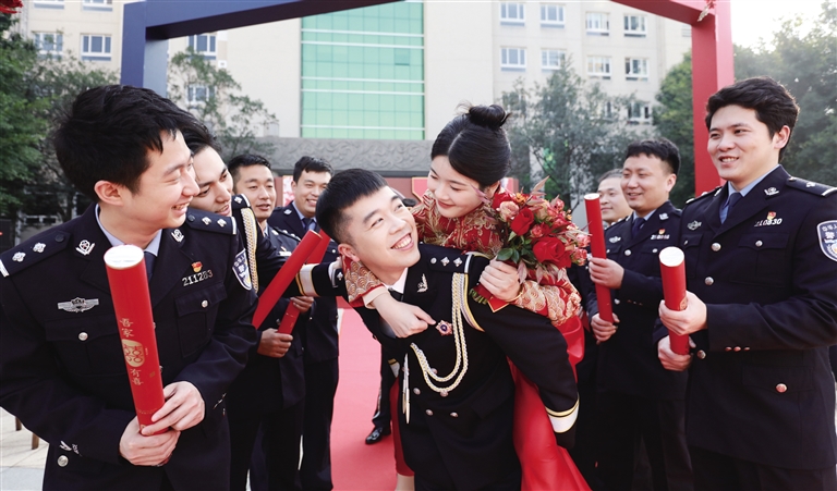 1月9日,民警黄玉簪背着新娘吴倩霞走过“幸福之门”。当日,浙江温州出入境边防检查站举行警察节集体婚礼,5对新人在庄严警徽的见证下缔结美好姻缘。(据新华社报道)