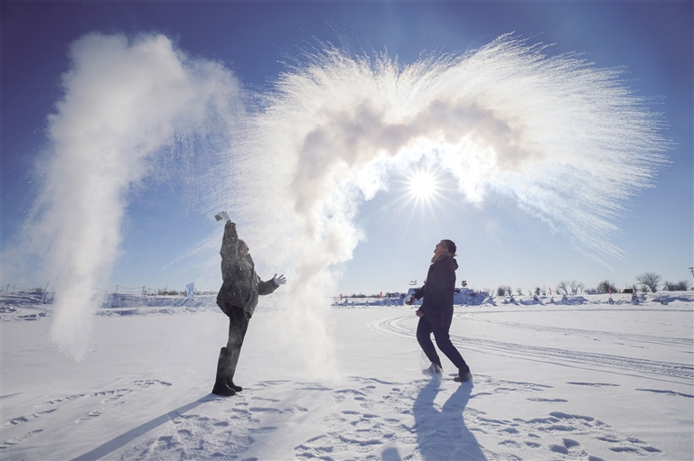 1月19日,来自北京等地的游客体验泼水成冰。当日,呼伦贝尔市海拉尔区最低温度-36℃,不少游客不畏严寒,在冰雪乐园等地游玩,感受冬日内蒙古的冰雪热情。