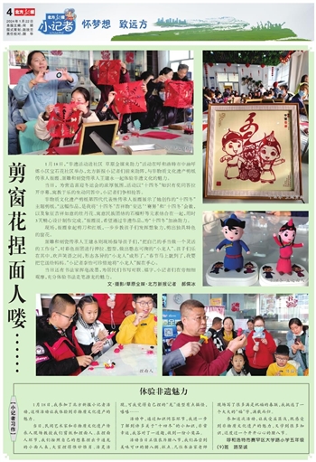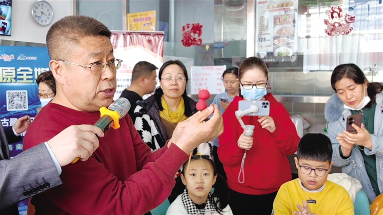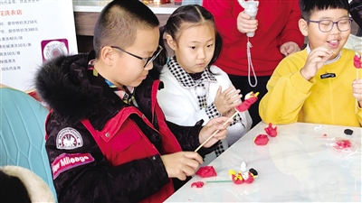 蛋雕和刻瓷传承人王建永则现场指导孩子们,“把自己的手当做一个灵活的工作台”,对彩色面团进行抻拉、塑型,做出憨态可掬的“小龙人”。孩子们乐在其中,欢声笑语之间,形态各异的“小龙人”成形了。“春节马上就到了,我要把它送给妈妈。”小记者李怡可珍惜地将“小龙人”握在手心。