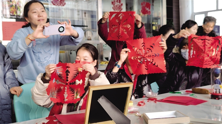 现场,崔霞拿起剪刀和红纸,一步步教孩子们发挥想象力,剪出独具特色的窗花。