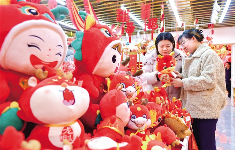 1月22日,呼和浩特市民在国贸批发城内选购龙年吉祥物。进入腊月以来,中国龙元素饰品走俏呼和浩特各大商超,将喜庆吉祥的氛围感拉满,同时承载着人们对新一年的美好祈愿。
