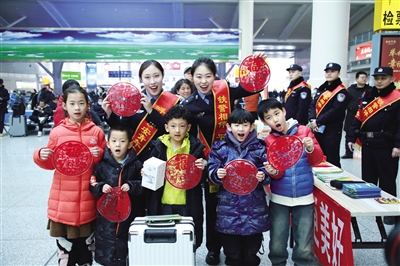 在呼和浩特东火车站候车室摆满福字和礼品的“摊位”前,挤满了求取春联和福字的旅客,8岁的小旅客在民警的指导下一字一句认真朗读《铁路安全管理条例》,知道了在铁道边玩耍的危险性。呼和浩特车站派出所民警采取寓教于乐的形式,在宣传活动中穿插歌曲、舞蹈等表演,吸引广大旅客纷纷驻足。期间,旅客与民警共唱“祝你平安”,表达对2024年新春的祝福、对平安回家的期盼。同时,民警还为旅客送上龙纹图案的窗花,增加了温馨的节日氛围。