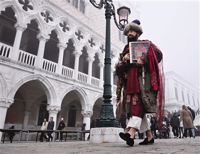 1月27日,一名男子手持《马可·波罗游记》走在意大利威尼斯圣马可广场。当日,2024年威尼斯狂欢节在威尼斯拉开序幕。今年正值意大利旅行家马可·波罗逝世700周年,狂欢节将举行相关主题活动。本届狂欢节将持续至2月13日。(据新华社报道)