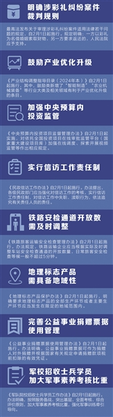 明确涉彩礼纠纷案件的审理裁判规则,规范公益事业捐赠票据使用和管理行为……2月起施行的这些新规涉及法律、金融等领域,进一步护航美好生活。