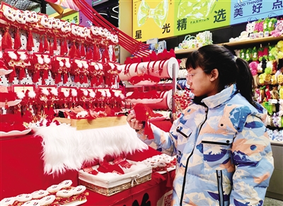 “除春联、福字热销外,寓意红红火火的春节福桶和龙元素中国结也成为消费新宠。”销售人员李女士介绍,今年的春节饰品在材质、款式和工艺等方面更亮眼,新颖多样、活泼可爱,卡通、动感、时尚,深受年轻消费者的欢迎。“款式很多,我都挑花眼了……”市民孙颖带着父母来置办年货,选购过程中感受浓浓的年味和喜庆。