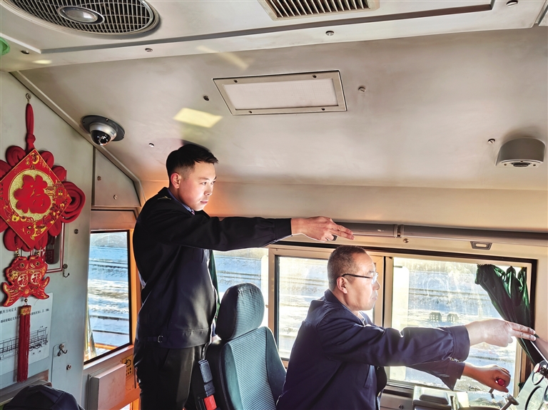 2日8时整,刘龙青登上和谐号机车。当日,中欧班列的值乘任务由司机巴嘎那、副司机刘龙青负责。在只有两人的驾驶室里,出发前的执行指令和确认呼唤动作仍充满仪式感——手指、口呼、确认信号,司机手握闸把,伴着阵阵风笛声,列车缓缓驶出二连站,经二连浩特铁路口岸驶往蒙古国扎门乌德站。