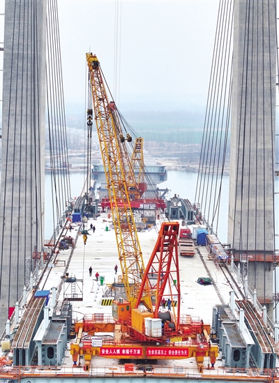 在湖北襄阳牛首汉江特大桥施工现场,施工人员进行吊装作业。