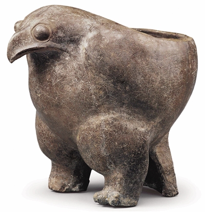 它双目圆睁,鹰嘴尖利如钩,两翼紧贴于身体两侧,尾部下垂至地,形成一种前扑的动势,仿佛随时准备向猎物出击。壮硕的躯体作鼎腹,鼎口设计在背部和两翼之间,尾巴与两只粗壮的鹰腿构成鼎的三足,一身乌黑光亮的“羽毛”和“肌肤”由细腻的泥质陶打造而成。鼎形器物特征与鹰的动物美感巧妙地融为一体,霸气与可爱并存。