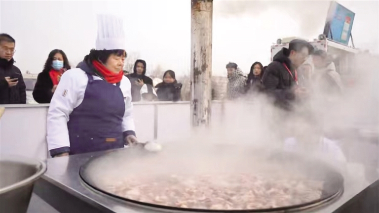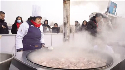 当日12时,热气腾腾的炖羊肉出锅了。此次准备了300多斤羊肉,1.2米锅大火炖,供游客和群众品尝。
