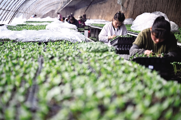 近日,工作人员在宁夏回族自治区银川市贺兰县天缘种业大棚内管护幼苗。银川市贺兰县育苗基地迎来年后生产高峰,工作人员加紧培育各类瓜果蔬菜幼苗,为即将到来的春耕、春播做好准备。摄影/新华社记者 王 鹏