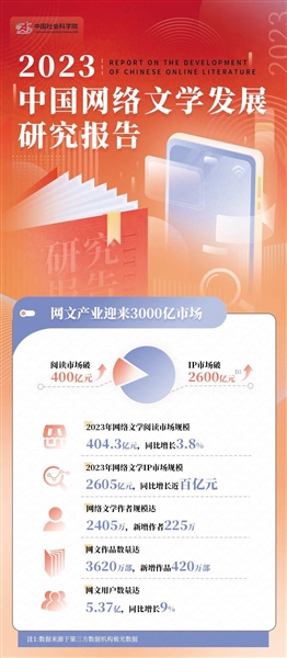 中国社会科学院文学研究所日前在京发布《2023中国网络文学发展研究报告》。报告显示,截至2023年底,中国网络文学阅读市场规模达404.3亿,同比增长3.8%,网络文学IP市场规模大幅跃升至2605亿元,同比增长近百亿,网文产业迎来3000亿元市场;中国网络文学作者规模达2405万,网文作品数量达3620万部,网文用户数量达5.37亿,同比增长9%。按照第52次《中国互联网络发展状况统计报告》中国网民数量10.79亿计算,中国网民近一半是网文用户。