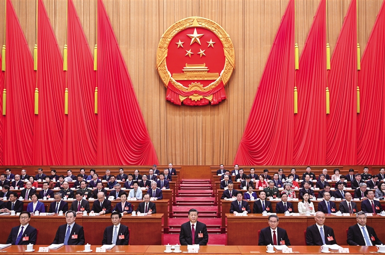 人民大会堂大礼堂气氛隆重热烈,主席台帷幕正中的国徽在鲜艳的红旗映衬下熠熠生辉。