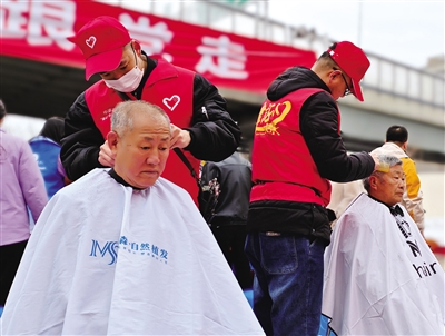 呼和浩特市新城区曙光社区,志愿者为居民理发。