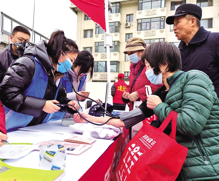 呼和浩特市新城区曙光社区,志愿者为居民义诊。