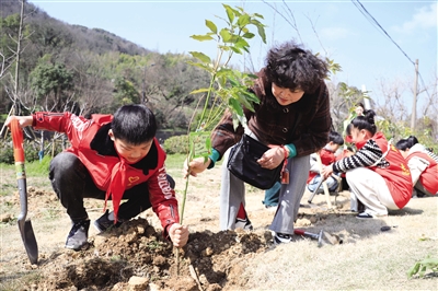 3月10日,在浙江省舟山市定海区,小朋友和家长参加义务植树活动。一年一度的植树节来临,人们参加多种形式的植树活动,为大地增添新绿。(据新华社报道)