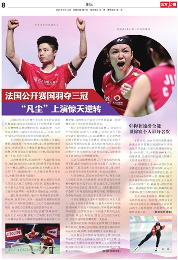 东京奥运会中国队夺得两枚金牌,国羽显然是把巴黎奥运会的夺金目标定在3枚金牌。这次法国公开赛可以说是巴黎奥运会羽毛球比赛的预演,国羽拿下3金无疑会增加球队打好巴黎奥运会的信心。(据《新民晚报》)