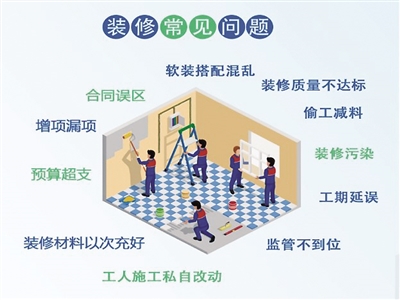 据呼和浩特市室内装饰协会会长于俊梅介绍,近年来装修投诉热点主要体现在:装修工期延误,如经营者不按合同约定时间交付家具产品或不按约定时间施工;全屋定制家具货不对板,如家具成品的尺寸、款式、颜色与合同约定和设计图不符;家装材料以次充好,以普通材料冒充环保材料,如宣称家装材料为“欧标”,但实际并无相关具体标准;家具建材卖场以约定或单方声明排除法定责任,如卖场内商家跑路,卖场以消费者未直接与其签订购买合同为由,拒绝承担柜台出租者义务。