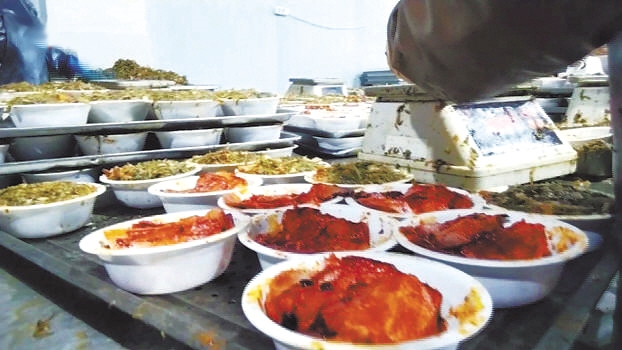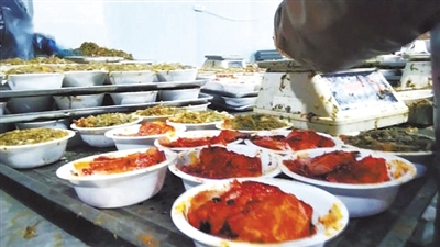 记者在安徽厨先生食品有限公司的院子里看到,露天摆放着大量冷冻槽头肉,室内有工人将加工好的劣质槽头肉进行切片,用槽头肉和梅菜进行装碗封装。