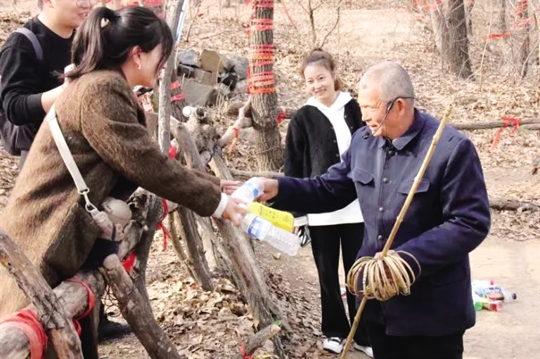 乔大爷说,出这个主意是为了调动游客积极性,刚开始一个瓶换一个圈,后来3个瓶换一个圈,也有背百十个瓶子上山换圈的游客,“瓶子换圈是个公益事业,为环保出点微薄之力”。