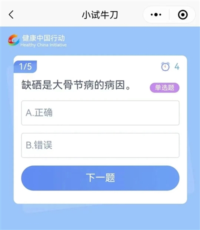 每次随机抽取5道题,不限时。可随时、多次进入答题,次数不限。此板块可为答题者提供更多练习机会,通过答题机制广泛学习健康知识。