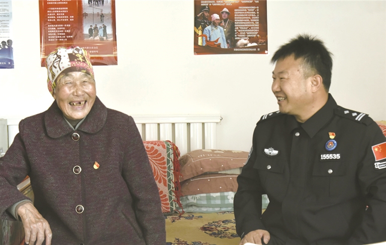 3月27日,阿拉善盟乌力吉口岸边境派出所民警一行深入阿拉善右旗巴丹吉林沙漠深处,看望驻守在这里的75岁老党员尼玛,为老人送去牛奶、蔬菜、水果等生活物资,倾听老人守卫边疆的故事。尼玛克服恶劣的自然环境,守护40多公里的边境线已有50载,为我国西北边疆安全稳定、维护和巩固国家统一、促进民族团结作出了重大贡献,创造了50年从未发生一起涉外事件的纪录,被称为中蒙边境线上的“活界碑”。 文·摄影/草原全媒·北方新报记者 张巧珍 通讯员 于凤东