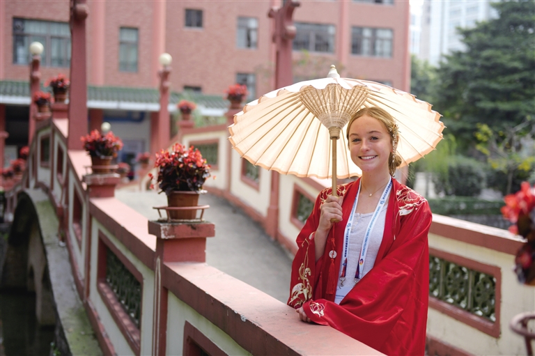 3月24日,美国华盛顿州中学生代表团成员在广州执信中学体验汉服。近日,作为中方5年邀请5万名美国青少年来华交流学习项目的新一批“友好使者”,美国华盛顿州中学生代表团在各地游览中国壮美的锦绣河山,体验丰富多彩的中国文化,感受中国民众的热情友好。