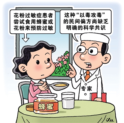 “蜂蜜中含有微量的蜂毒和花粉颗粒,有的花粉过敏患者希望通过少量、循序渐进地服用蜂蜜,‘以毒攻毒’来让身体接纳花粉,减少过敏的发生。”北京大学人民医院耳鼻咽喉头颈外科主任医师王旻表示,尽管蜂蜜具有一定的抗过敏作用,但这种方法并没有明确的科学共识。