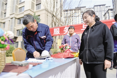 4月8日,志愿者为居民磨菜刀。当日,呼和浩特市新城区丁香路区域服务中心安泰社区举办了“志愿服务暖民心 用心点亮文明城”活动,志愿者们为居民提供了磨菜刀、义务理发和清洗地垫等便利服务,营造了和谐温馨的社区氛围。摄影/草原全媒·北方新报首席记者 牛天甲
