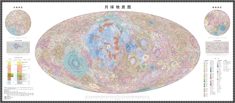 月球地质图是月壳表层地质构造、岩浆活动、矿产分布等信息的综合表达,能够集中、直观地呈现人类对月球的观测、研究成果,能够帮助人们更好地认识月球,也能为月球科研与探测,乃至月球基地建设提供有力支撑。