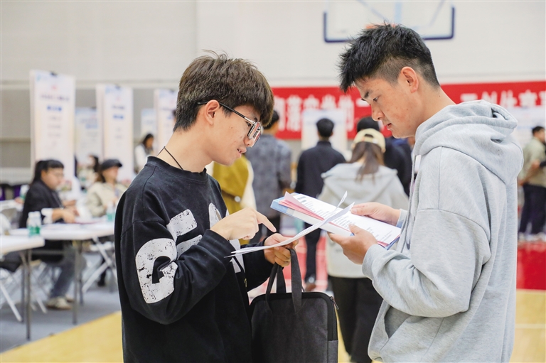 4月25日,工作人员正在向求职者介绍岗位需求、招聘条件和薪资待遇等信息。当日,内蒙古师范大学在赛罕校区体育馆举行了“筑梦青春 ‘职’等你来”春季招聘大会。来自区内外的上百家企业前来寻觅良才,提供的岗位涵盖餐饮、服务、教育科技等多个领域。摄影/草原全媒·北方新报首席记者 牛天甲