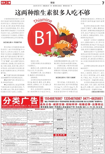 维生素B1又叫硫胺素或抗神经炎因子,成年男性需要量为1.4毫克/天,女性为1.2毫克/天。如果供给不足将给人体健康带来很大麻烦,最严重的表现是“脚气病”,这个病不同于我们平时所说的“脚气”或“脚癣”,成人患脚气病首先出现体弱、易疲倦,然后表现为头痛、失眠、眩晕、食欲不振、消化不良等症状。此时如果不补充维生素B1就可能继续发展为三种类型的脚气病。
