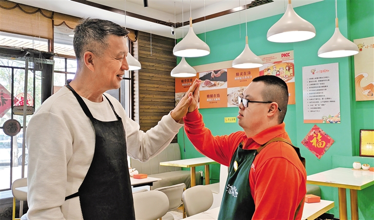 “他们每天来到店里有事可做,不仅性格变得开朗,还得到锻炼。”洪波说,希望能将自己的店铺打造成一个样板店,让它的运营模式具备借鉴、复制的可能性,可以帮助更多残障人士在工作中康复、锻炼,实现自己的人生价值。