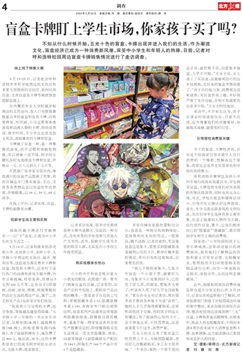 此外,加强校园周边消费环境监管也是不少家长的心声。5月15日,记者从市场监管部门了解到,市场监管部门加强了对校园周边环境的集中整治,重点加强环境综合治理,整治校园周边违规销售“三无”盲盒、卡牌和有害出版物等。在检查中,执法人员也提醒商家:不得向未满8周岁的未成年人销售盲盒和卡牌,如果销售,应当依法确认已取得相关监护人的同意。
