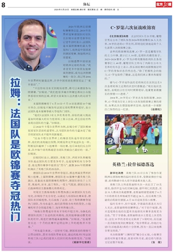 本届欧锦赛将于6月14日~7月14日在德国10个城市举办。拉姆毫不掩饰对法国足球的赞赏和看好,表示法国队是本届赛事最大夺冠热门球队。