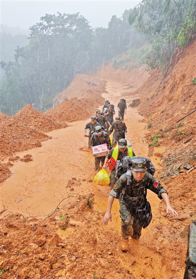 烈日之下,他们的脸被晒得通红,可即便汗水湿透衣背,灌满胶鞋,他们年轻的面庞上仍写满了坚毅,“小困难,能克服!我们累点不算啥”。